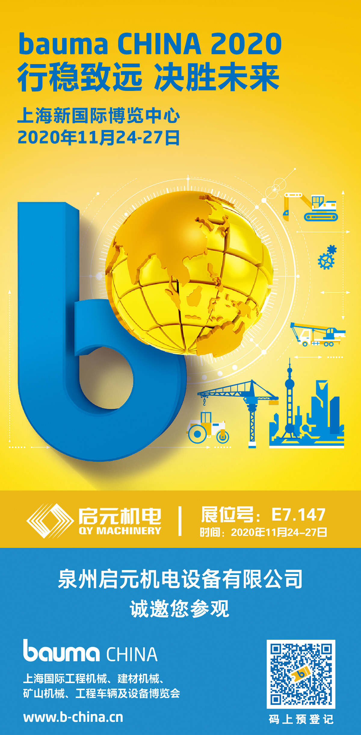 在此泉州啟元機電設(shè)備有限公司誠摯邀請您的光臨,相約上海,相約Bauma China 2020 展會時間 :2020年11月24-26日 09:00-17:00 2020年11月27日 09:00-15:00 展 館:上海新國際博覽中心(SNIEC) 地 址:上海浦東新區(qū)龍陽路2345號 展 位 號:室內(nèi)E7.147